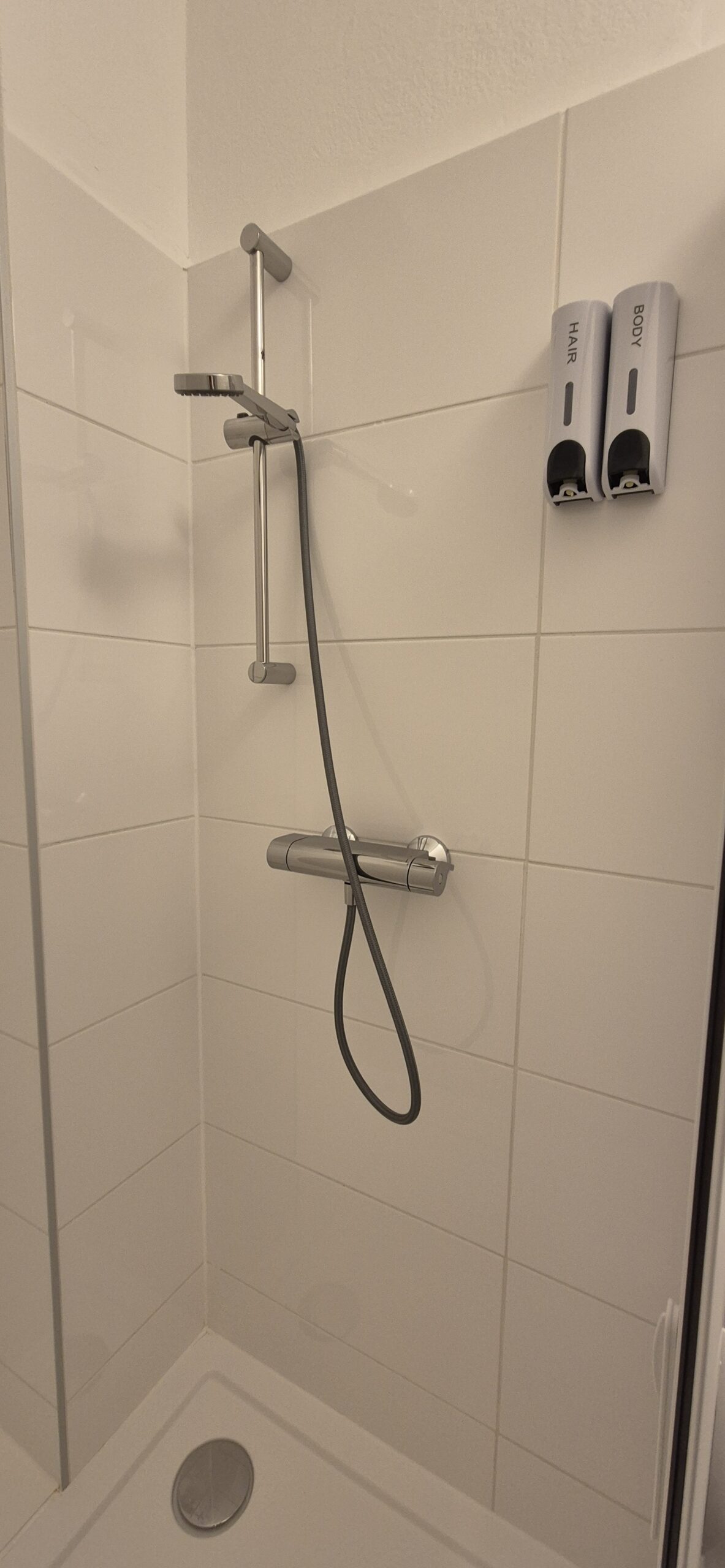 Bathroom: Shower, towels, toilet paper, free toiletries, hairdryer